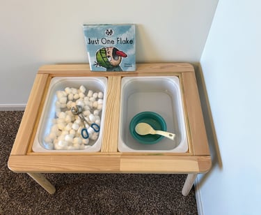 After reading Just One Flake, we set up a super simple winter sensory bin that turned snowflakes into hands-on play. You likely have everything you need around the house: cotton balls, cups, scoops, tongs, and bowls.